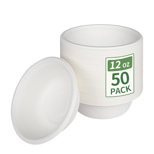 Aricsen Compostable 12 Ounce 50 Pack Disposable Small Round Paper Bowls, PFAS-Free, Eco-Friendly, Biodegradable Bagasse For Hot Soup Food Salad Dinner Party (50, 12 OZ)