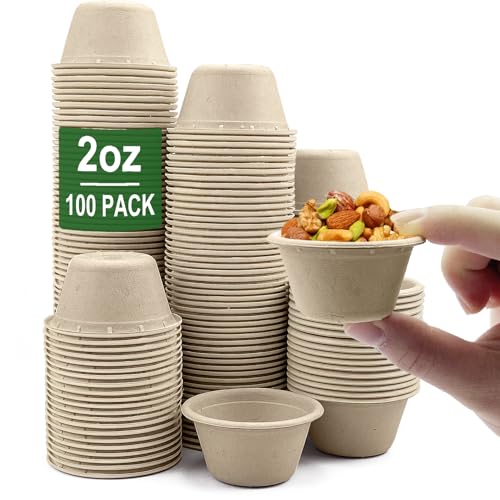 [High Quality Durability Natural Bagasse Fiber Cups] - Each package includes 100 pieces bagasse souffle cups, the size of each paper condiment cups is 2oz. They come with elegant natural color , the classic natural compostable sample cup goes well with various food. These paper souffle cups are made of biodegradable and compostable bagasse fiber. It is microwavable and freezer safe. Even if these 2 ounce cups are disposable, you don't have to worry about their damage to the environment.