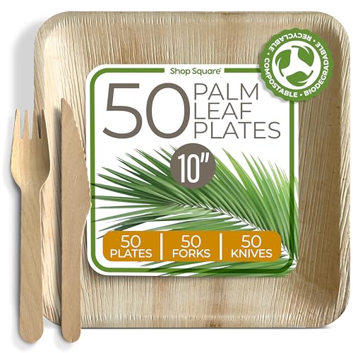 150 PACK COMPLETE SET – Includes 50 palm leaf plates, 50 forks, and 50 knives, perfect for parties, events, or everyday use with convenient, eco-friendly cutlery included.